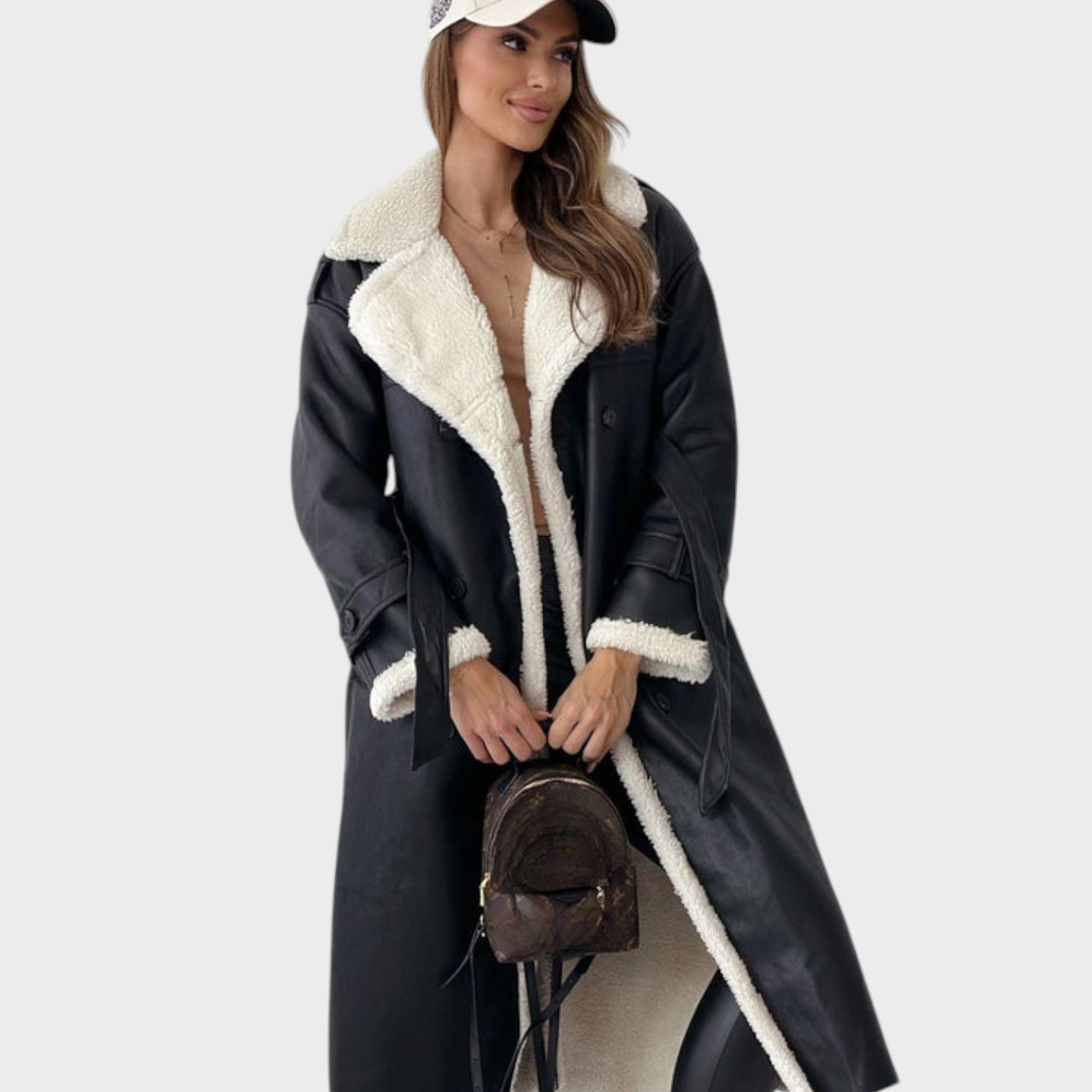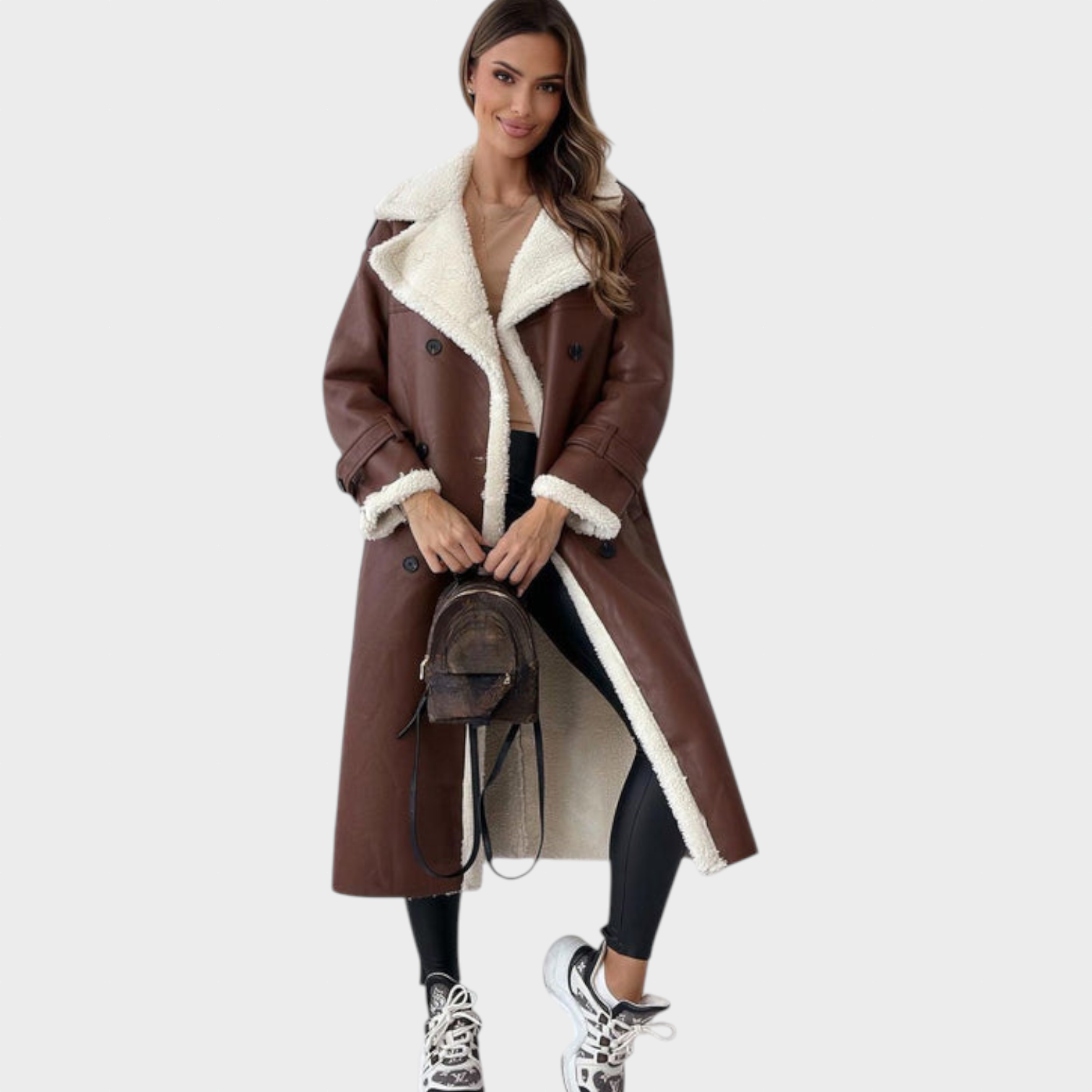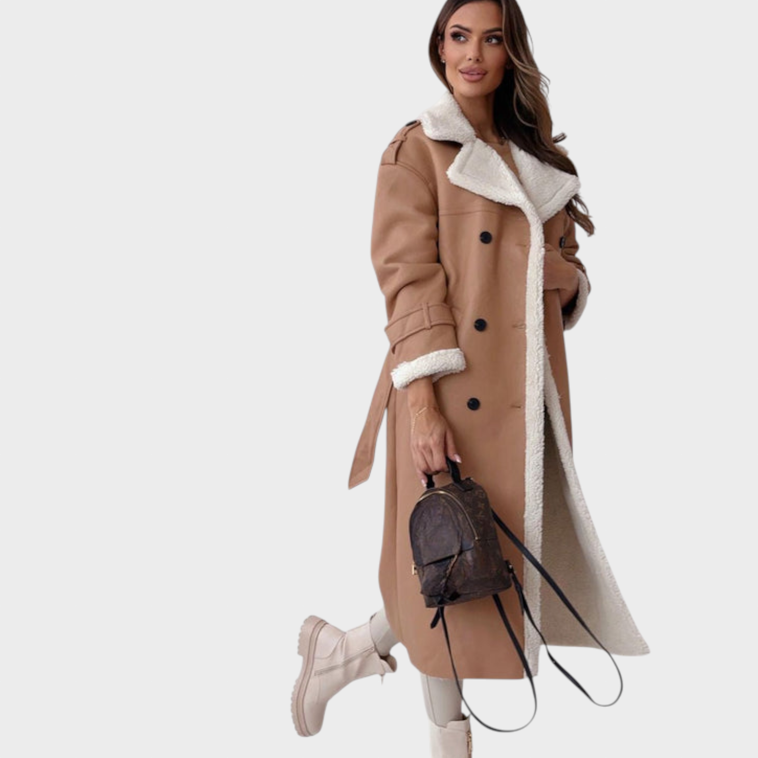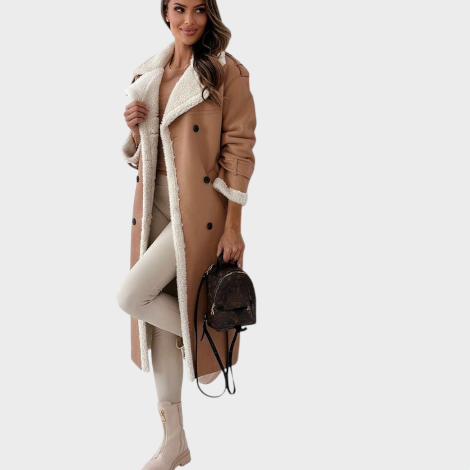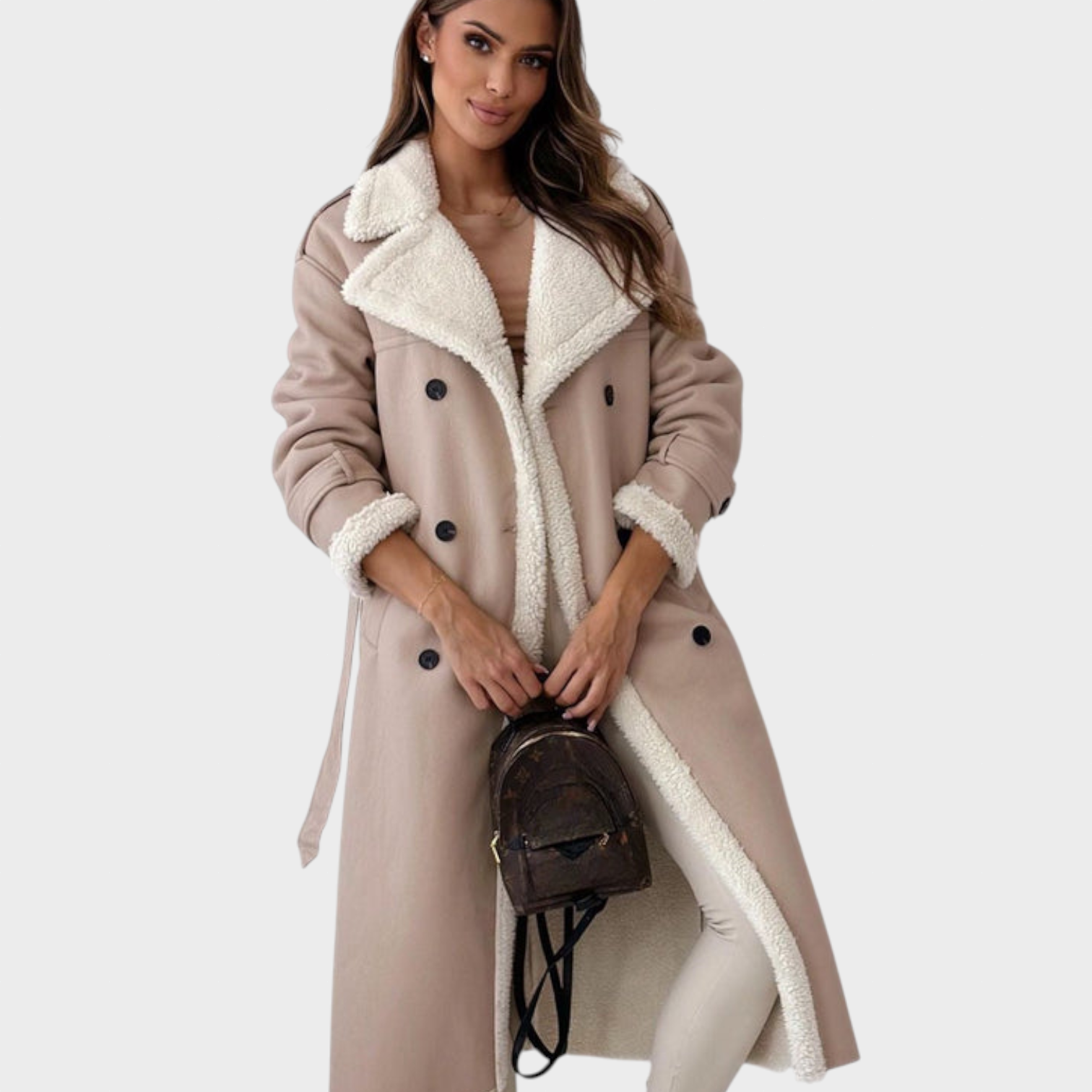 Ženski plašč Viktorie je popolno ravnovesje med brezčasno eleganco in udobjem. Mehka teddy podloga vas prijetno greje, medtem ko klasična silhueta, navdihnjena s trenčem, lepo poudari postavo in doda pridih prefinjenosti. Dvojno zapenjanje in pas v predelu pasu poudarjata sofisticiran videz, ki je primeren tako za vsakdan kot za posebne priložnosti.
